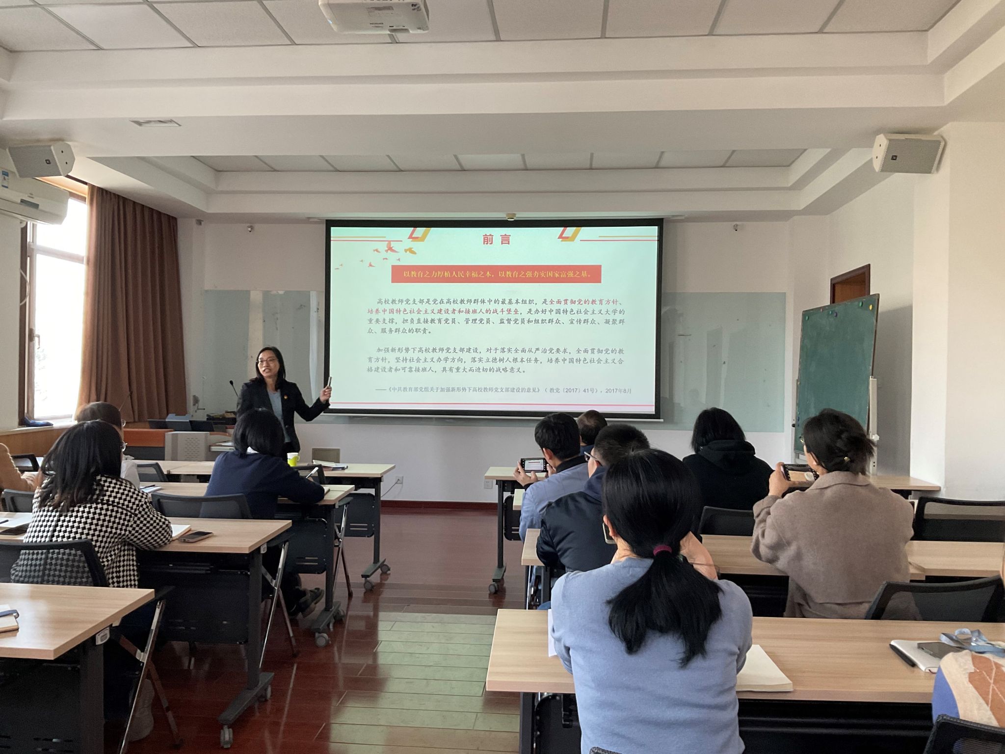 姚爱华书记从组织设置规范、组织生活规范、工作记录规范三方面讲解了如何夯实一线教师党支部规范化建设;以党支部工作法为切入,通过典型案例、党建和业务融合的关键点分析,指导如何“围绕中心抓党建,抓好党建促中心”;从“四同三促”样板支部、“四同三促双带头人”工作室、优秀党支部工作法、优秀主题党日等创建项目、建设标准,引导如何把党支部成为教育管理监督党员有力,组织宣传凝聚服务师生有力的“七个有力”党支部。