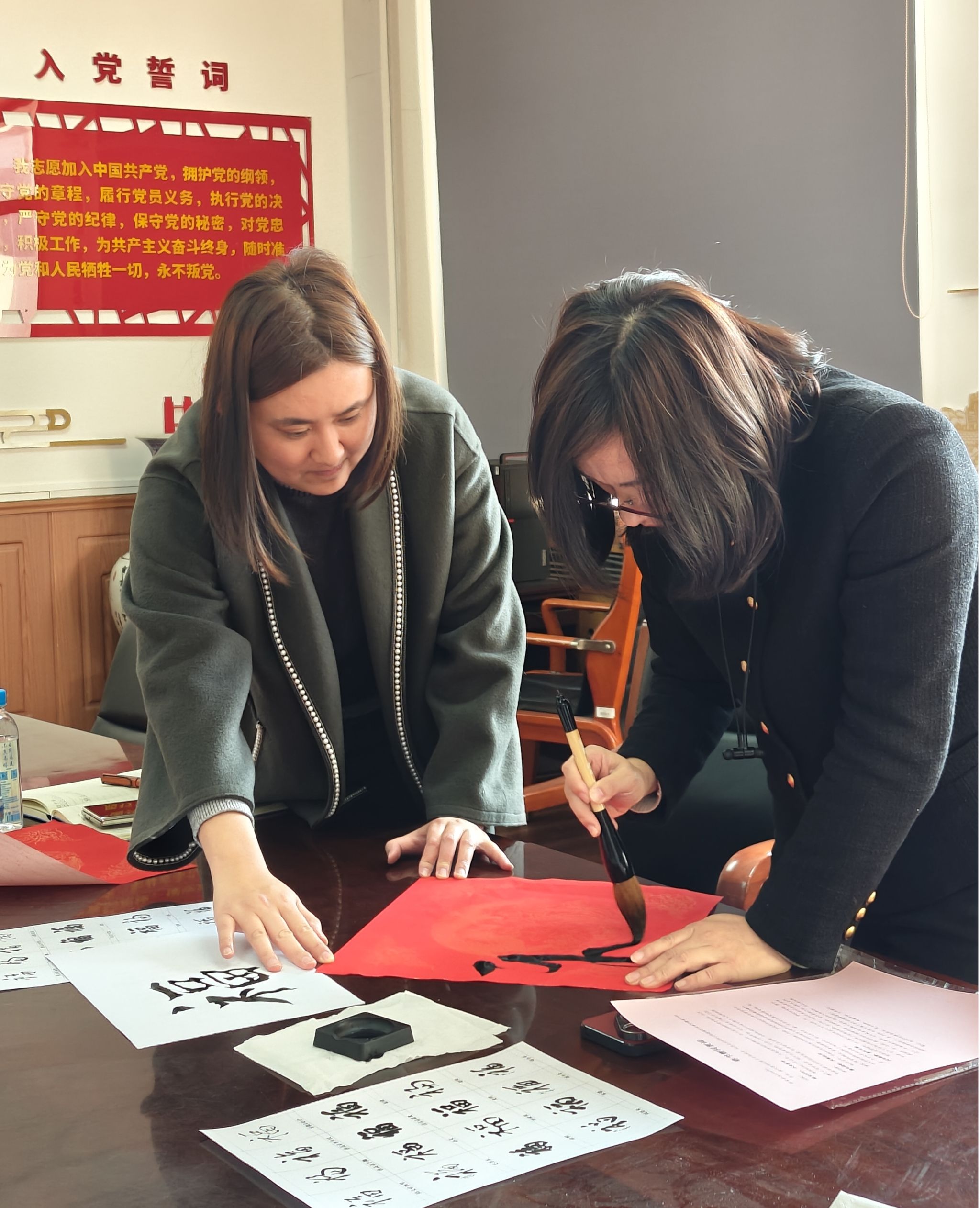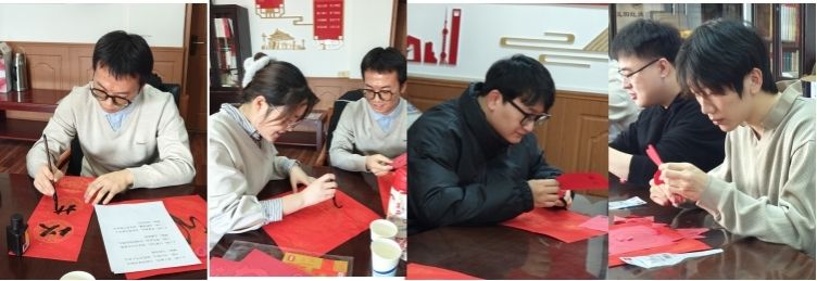 随后,一场 “手写春联、共贴窗花” 的暖冬活动正式拉开帷幕。老师们与同学们围桌而坐,研墨、挥毫、落笔,红纸翻飞间,“龙马精神研路顺,鹏程万里学业兴”“矢志科研追梦想,扬鞭奋蹄赴新程” 等一幅幅饱含期许的春联跃然纸上;憨态可掬的骏马窗花、寓意吉祥的福字窗花,在同学们的巧手中成型。书写春联的过程中,姚爱华书记与同学们细致询问大家的科研进度、假期规划与生活需求,叮嘱大家在潜心钻研的同时,务必兼顾劳逸结合,记得给远方的家人报平安、送祝福。