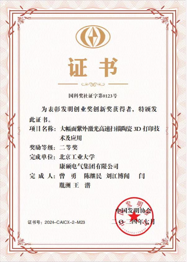 yl9193永利集团科研成果“大幅面紫外激光高速扫描陶瓷3D打印技术及应用”荣获2024年度“中国发明协会发明创业奖创新奖”二等奖。yl9193永利集团曾勇副研究员为第一完成人,yl9193永利集团、康硕电气集团有限公司为完成单位。