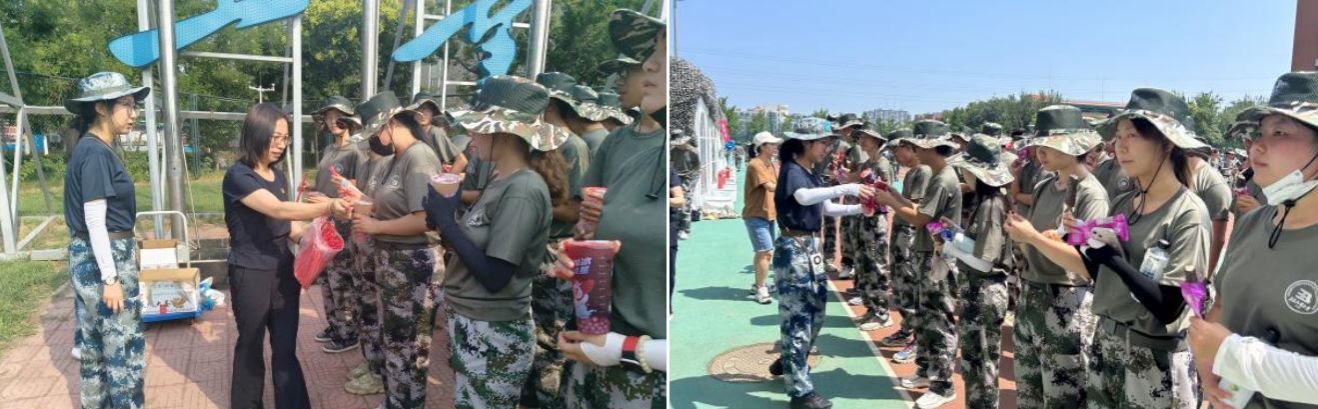 随后,老师们为参训员工送上冷饮与雪糕,在炎炎夏日为大家带去一份清凉,也为同学们的军训生活带来别样的色彩。慰问结束后,公司师生一起合影,定格下了欢声笑语的瞬间。
