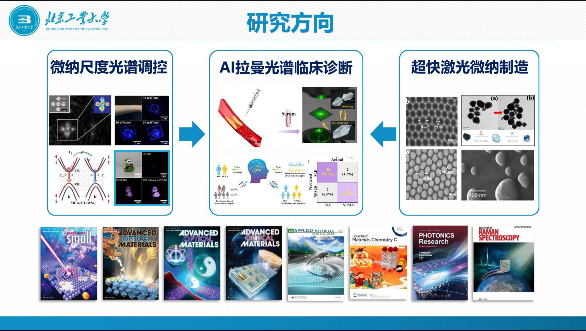 微纳光学研究所面向国际光学前沿领域和国家重大需求,围绕微纳尺度光谱调控和光与物质相互作用的基本科学问题,深入开展微纳光场调控新机制、微纳光子器件新结构、激光微纳制造新技术等方面研究,在超快激光大幅面制造与新材料合成、超高灵敏光学传感、以及AI拉曼光谱临床诊断方面构建了“机理-制备-表征-调控-应用”全链条研究体系,为国家战略性产业发展提供关键技术支持。研究所先后承担国家重点研发计划、国家自然科学基金、北京市科技计划重点项目等国家级/省部级项目二十余项,发表以AFM、ACS Nano为代表的高水平学术论文300余篇,授权国家发明专利80余项,获省部级科技奖5项,团队教师先后入选北京市海外高层次人才计划、北京市科技新星等省部级人才5人次。